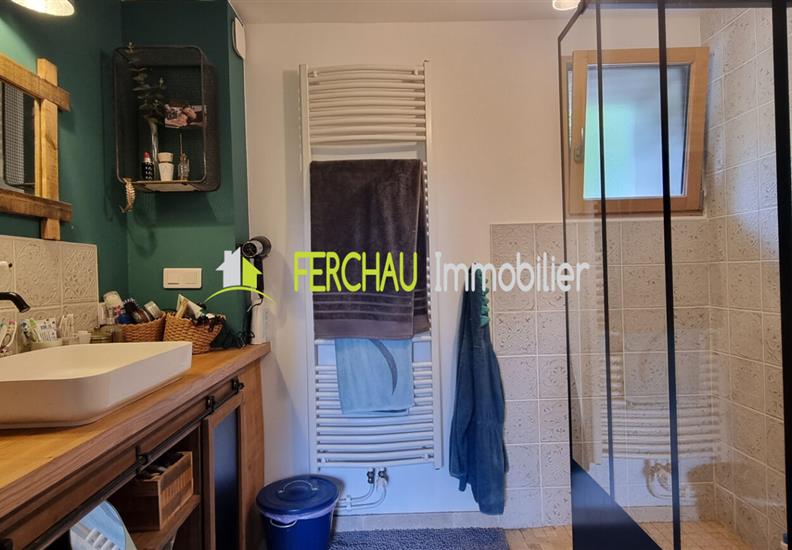 Au rez de chaussée vous découvrirez une cuisine équipée et aménagée semi-fermée avec une verrière style industrielle, arrière cuisine/buanderie avec accès au garage, salle à manger, salon équipé d'un poêle à granules, chambre parentale avec sa salle d'eau privative, WC indépendant.