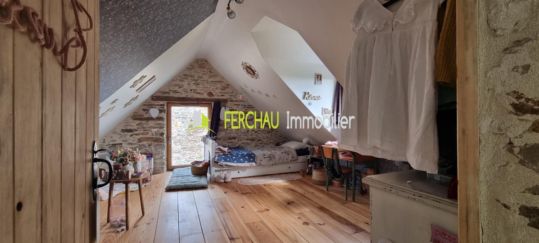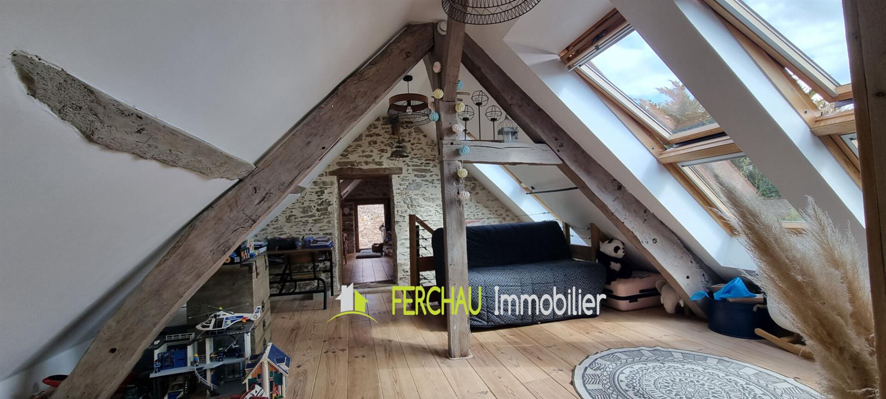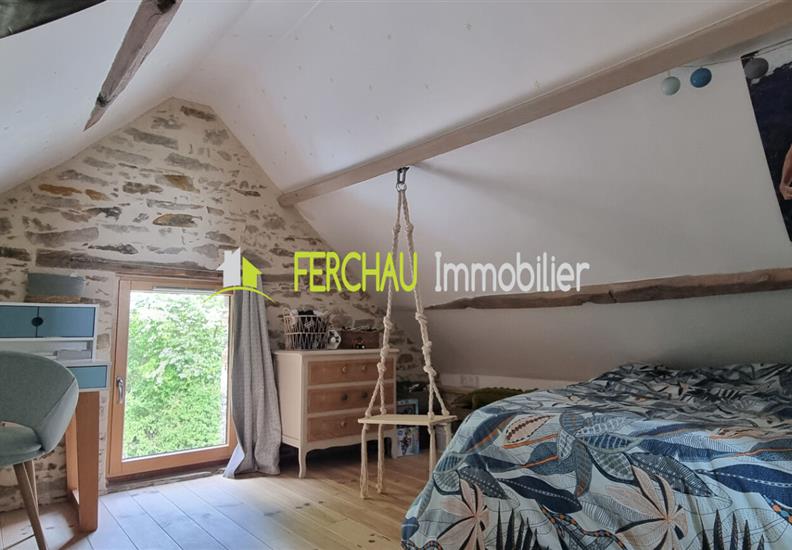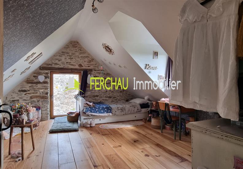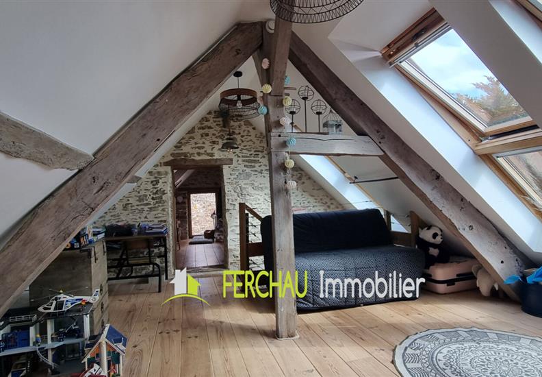 A l'étage vous arriverez sur un espace mezzanine pouvant servir de salle de jeux pour les enfants ou d'espace bureau, 2 chambres, salle d'eau et WC.